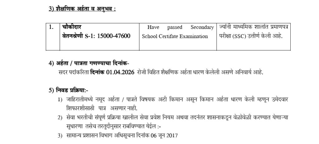 आयुक्त, आदिवासी विकास विभाग, महाराष्ट्र राज्य नाशिक यांचे अंतर्गत असलेले प्रकल्प अधिकारी, एकात्मिक आदिवासी विकास प्रकल्प (29) यांचे अधिनस्त आस्थापनेवरील शासकीय आश्रमशाळा व वसतिगृहातील चौकीदार (गट-ड) संवर्गातील शासन पत्र क्रमांक MTD-36024/88/2024-MTD (Desk-15)/दिनांक 02.12.2025 नुसार सरळसेवेच्या कोटयातील रिक्त पदे 100 टक्के भरण्यास दिलेल्या मान्यतेनुसार खाली नमूद केलेल्या रिक्त पदांकरिता पात्र उमेदवारांकडून ऑनलाईन पध्दतीने अर्ज मागविण्यात येत आहेत. ऑनलाईन पध्दतीने अर्ज भरावयाची सुविधा https://tribal.maharashtra.gov.in या संकेतस्थळावर https://tdcwatchman2026.cbtexam.in या लिंक वर उपलब्ध करुन दिलेली आहे.