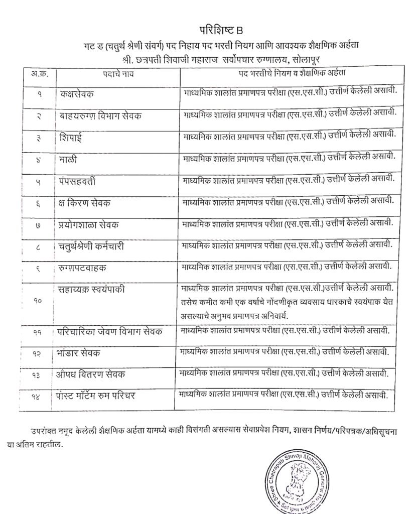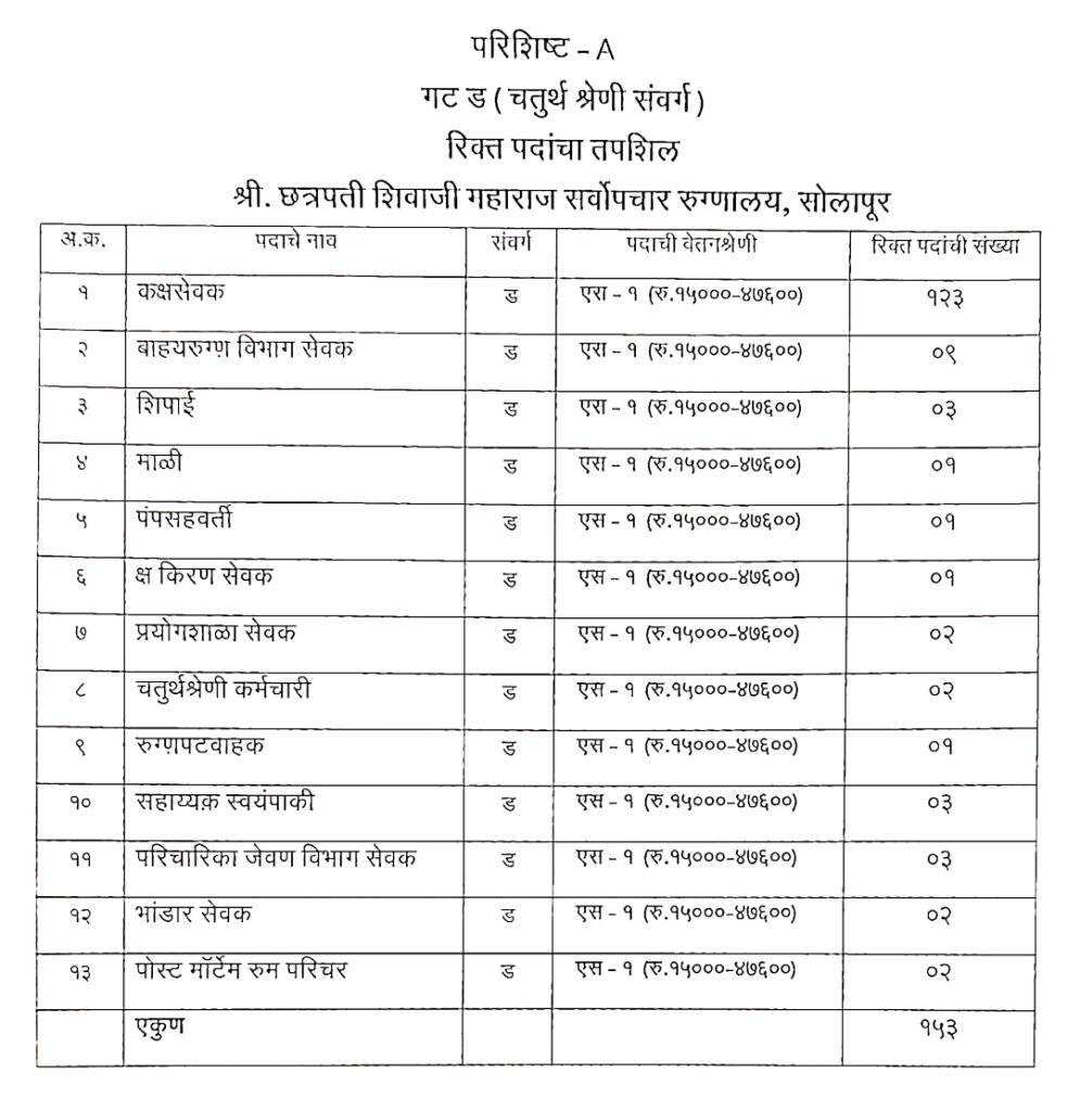 श्री छत्रपती शिवाजी महाराज सर्वोपचार रुग्णालय सोलापूर यांचे आस्थापनेवरील गट ड च्या विविध संवर्गातील एकूण 153 रिक्त पदे सरळसेवेने (नामनिर्देशनाने) भरण्याकरीता आयोजित परीक्षेसाठी या जाहीरातीत नमूद केल्याप्रमाणे पदाची शैक्षणिक अर्हता व इतर अटींची पूर्तता करण्या-या पात्र उमेदवारांकडुन विहीत मुदतीत अधिकृत संकेतस्थळावर ऑनलाईन पध्दतीने अर्ज मागविण्यात येत आहे.