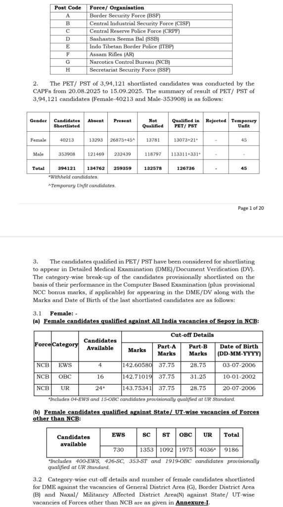 Constable (GD) in Central Armed Police Forces (CAPFs) and SSF, Rifleman (GD) in Assam Rifles, and Sepoy in Narcotics Control Bureau Examination, 2025 Result for shortlisting of candidates to appear in Detailed Medical Examination (DME)/Document Verification (DV).
